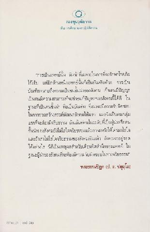 505 0 ^aรักษาใจยามรักษาคนไข้ --^tการศึกษาแพทยศาสตร์ในสังคมไทย --^tการแพทย์แนวพุทธ --^tอายุรแพทย์กับปัญหาจริยธรรม --^tบทบาทของแพทย์กับความหวังจากคนไข้ --^tกรรมกับโรคพันธุกรรม ในทัศนะพระพุทธศาสนา