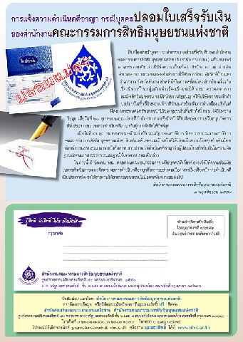 -- การแจ้งความดำเนินคดีอาญา กรณี บุคคลปลอมใบเสร็จรับเงินของสำนักงานคณะกรรมการสิทธิมนุษยชนแห่งชาติ.