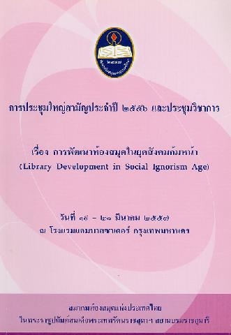 การประชุมใหญ่สามัญประจำปี 2556 และประชุมวิชาการ เรื่อง การพัฒนาห้องสมุดในยุคสังคมก้มหน้า วันที่ 19-21 มีนาคม 2557 ณ โรงแรมแอมบาสซาเดอร์ กรุงเทพมหานคร / สมาคมห้องสมุดแห่งประเทศไทย