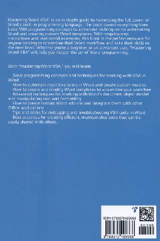 520 ^a" Mastering Word VBA " is an in-depth guide to harnessing the full power of Word's built-in programming language. The book covers everything from basic VBA programming concepts to advanced techniques for automating Word and creating custom Word templates. With step-by-step instructions and real-world examples, this book is the perfect resource for anyone looking to streamline their Word workflow and take their skills to the next level. Whether you're a beginner or an advanced user, "Mastering Word VBA" will help you master the art of Word programming.