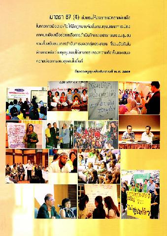 [กรุงเทพฯ] : คณะอนุกรรมการรับฟังความคิดเห็นในคณะกรรมการเตรียมการจัดตั้งสภาพัฒนาการเมืองและยกร่างแผนแม่บทพัฒนาการเมือง, 2550.