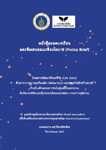 หนังสือถอดบทเรียนและข้อเสนอแนะเชิงนโยบาย (Policy Brief) : โครงการพัฒนาทักษะชีวิต (Life Skills) ด้วยกระบวนการสะท้อนคิด (Reflection) และสมุดบันทึกสร้างสรรค์สำหรับเด็กและเยาวชนในศูนย์ฝึกและอบรม สังกัดกรมพินิจและคุ้มครองเด็กและเยาวชน กระทรวงยุติธรรม/ วรรณพร พงษ์เพ็ง, พงษ์กรณ์ วีรพิพรรธน์, มกุฏ อรฤดี และพิมพนิต คอนดี