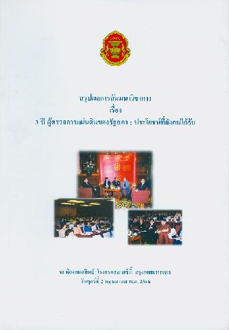 สรุปผลการสัมมนาวิชาการเรื่อง 3 ปี ผู้ตรวจการแผ่นดินของรัฐสภา : ประโยชน์ที่สังคมได้รับ ณ ห้องกมลทิพย์ โรงแรมสยามซิตี้ กรุงเทพมหานคร วันศุกร์ที่ 2 พฤษภาคม พ.ศ. 2546 / สำนักงานผู้ตรวจการแผ่นดินของรัฐสภา