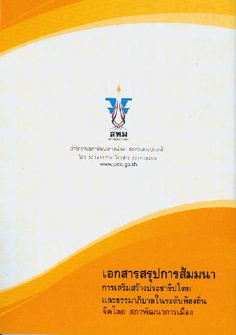 เอกสารสรุปการสัมมนา การเสริมสร้างประชาธิปไตยและธรรมาภิบาลในระดับท้องถิ่น จัดโดย สภาพัฒนาการเมือง ; เรียบเรียงและจัดทำเอกสารโดย : สำนักแผนพัฒนาการเมือง