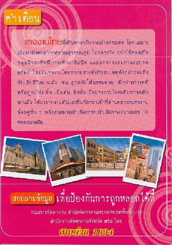 [กรุงเทพฯ : กองตรวจและคุ้มครองคนหางาน กรมการจัดหางาน, 2552].