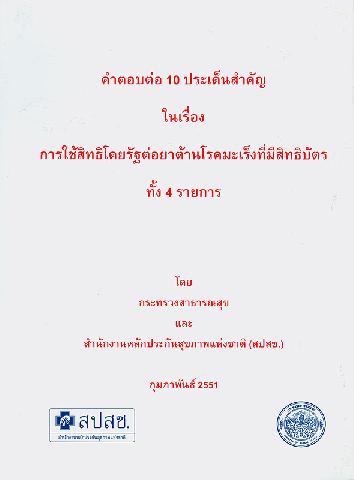 คำตอบต่อ 10 ประเด็นสำคัญในเรื่องการใช้สิทธิโดยรัฐต่อยาต้านโรคมะเร็งที่มีสิทธิบัตรทั้ง 4 รายการ กระทรวงสาธารณสุข และ สำนักงานหลักประกันสุขภาพแห่งชาติ