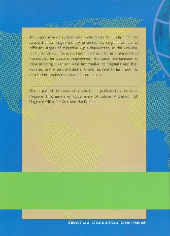 520 ^aReviews policies and programmes the Philippines has adopted as an origin country to protect its migrant workers at different stages of migration - pre-deployment, at the worksite, and upon return. Looks in detail at features of regulatory frameworks for overseas employment, the varied mechanisms for disseminating clear and vital information to migrants and their families, and what institutional structures need to be present to ensure fair application of rules to migrants.