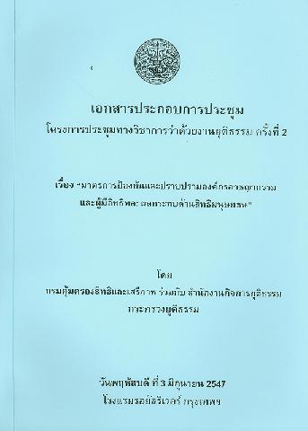 เอกสารประกอบการประชุมโครงการประชุมทางวิชาการว่าด้วยงานยุติธรรม ครั้งที่ 2 เรื่อง มาตรการป้องกันและปราบปรามองค์กรอาชญากรรมและผู้มีอิทธิพล : ผลกระทบด้านสิทธิมนุษยชน วันพฤหัสบดี ที่ 3 มิถุนายน 2547 โรงแรมรอยัลริเวอร์ กรุงเทพฯ โดย กรมคุ้มครองสิทธิและเสรีภาพ ร่วมกับ สำนักงานกิจการยุติธรรม กระทรวงยุติธรรม