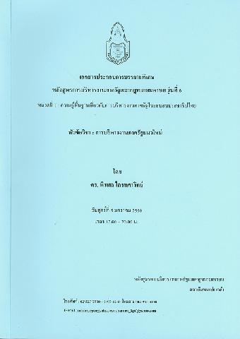 500 ^aเอกสารประกอบการบรรยายพิเศษ หลักสูตรการบริหารงานภาครัฐและกฎหมายมหาชน รุ่นที่ 6 หมวดที่ 1 : ความรู้พื้นฐานเกี่ยวกับการบริหารงานภาครัฐในระบอบประชาธิปไตย หัวข้อวิชา : การบริหารงานภาครัฐแนวใหม่ วันศุกร์ที่ 5 มกราคม 2550 เวลา 17.00 - 20.00 น.