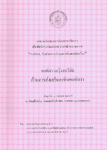 เอกสารประกอบการสัมมนาทางวิชาการเนื่องในวันคนพิการสากล ประจำปี พ.ศ.2547 "คนพิการ...หุ้นส่วนการสร้างมูลค่าเพิ่มของสังคมไทย" องค์ความรู้งานวิจัยด้านการส่งเสริมอาชีพคนพิการ วันศุกร์ที่ 3 ธันวาคม 2547 ณ ห้องปรินซ์ 3 โรงแรมปรินซ์พาเลซ มหานาค กรุงเทพมหานคร / สำนักส่งเสริมและพิทักษ์คนพิการ สำนักงานส่งเสริมสวัสดิภาพและพิทักษ์เด็ก เยาวชน ผู้ด้อยโอกาส คนพิการและผู้สูงอายุ