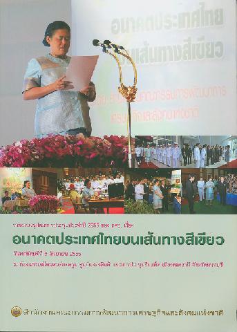 รายงานสรุปผลการประชุมประจำปี 2555 ของ สศช. อนาคตประเทศไทยบนเส้นทางสีเขียว วันพฤหัสบดีที่ 6 กันยายน 2555 ณ ห้องแกรนด์ไดมอนด์บอลรูม ศูนย์แสดงสินค้าและการประชุมอิมแพ็ค เมืองทองธานี จังหวัดนนทบุรี สำนักงานคณะกรรมการพัฒนาการเศรษฐกิจและสังคมแห่งชาติ