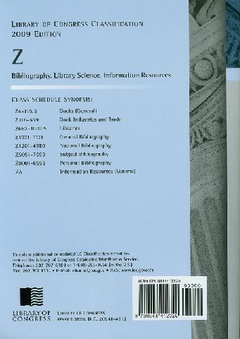 Library of Congress classification. Z : Bibliography, Library science, Information resources prepared by the Policy and Standards Division, Library of Congress
