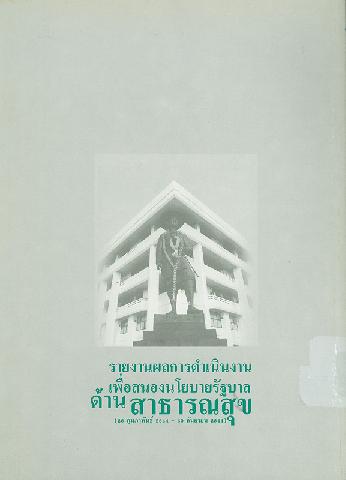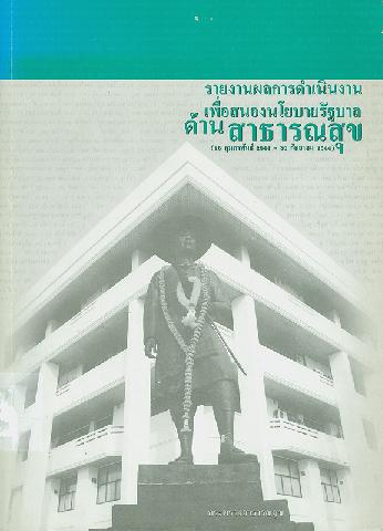 รายงานผลการดำเนินงานเพื่อสนองนโยบายรัฐบาลด้านสาธารณสุขและแนวนโยบายพื้นฐานแห่งรัฐ (20 กุมภาพันธ์ 2544 - กันยายน 2544) กระทรวงสาธารณสุข ; จัดทำโดย มณีรัตน์ แซ่ภู่ และกนกวรรณ ศรีเจริญ