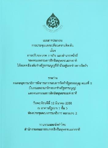 เอกสารประกอบการประชุมแลกเปลี่ยนความคิดเห็น เรื่อง การปรับบทบาท ภารกิจ และอำนาจหน้าที่ของคณะกรรมการการสิทธิมนุษยชนแห่งชาติให้สอดคล้องกับร่างรัฐธรรมนูญที่กำลังอยู่ระหว่างการจัดทำระหว่างคณะอนุกรรมาธิการกรอบการจัดทำรัฐธรรมนูญ คณะที่ 8 (ในคณะกรรมาธิการยกร่างรัฐธรรมนูญและคณะกรรมการสิทธิมนุษยชนแห่งชาติ) : วันพฤหัสบดีที่ 12 มีนาคม 2558 ณ อาคารรัฐสภา 1 ชั้น 3 ห้องประชุมคณะกรรมาธิการ หมายเลข 2 / สำนักงานคณะกรรมการสิทธิมนุษยชนแห่งชาติ.